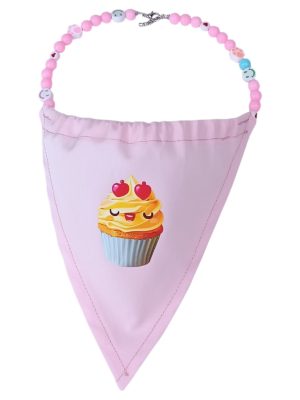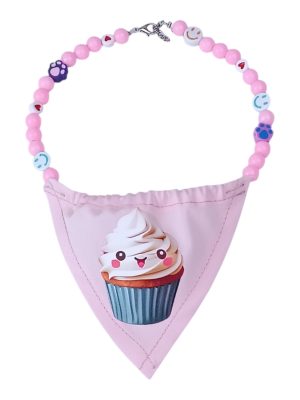 Custom Personalized Name Dog Bandana Necklace – Pink Cupcake Print – Medium Breed Dog Jewelry – Pink Acrylic Beads with Heart, Smile & Paw Charms – Handmade 34cm Adjustable Length