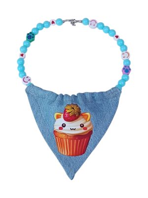 Handmade Denim Dog Bandana Necklace for Medium Dogs – Cute Cupcake Print – Blue Beaded Jewelry with Smile, Paw & Heart Charms – Adjustable 34cm Length – Personalized Pet Accessory