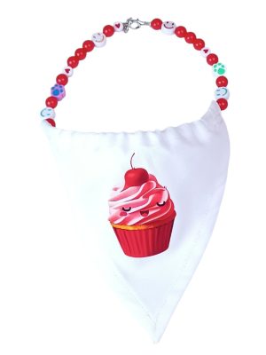 Handmade Medium Dog Bandana Necklace with Cupcake Stamp – Vibrant Red Beaded Jewelry – Smile, Heart & Paw Charms – Custom Size 34cm Adjustable – Personalized Accessory for Medium Breeds