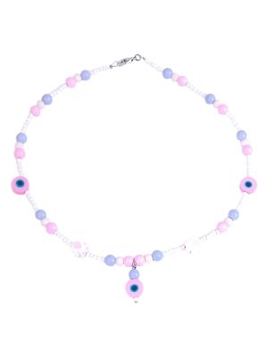 Girls 12+ Kawaii “Sweet Eye Charm” Necklace – Handmade Pastel Beaded Necklace with Pink, Lilac & White Glass Beads and Evil Eye Pendant