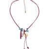 Crafted with a red and white cord and adorned with coral, mother of pearl, agate, howlite, and glass beads in sea and sun tones.