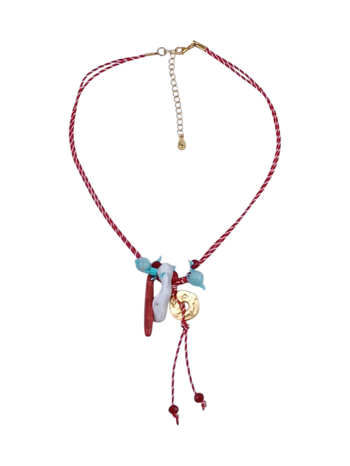 Handmade boho “March” necklace inspired by Greek tradition, red and white adjustable cord with coral, mother of pearl, agate & howlite
