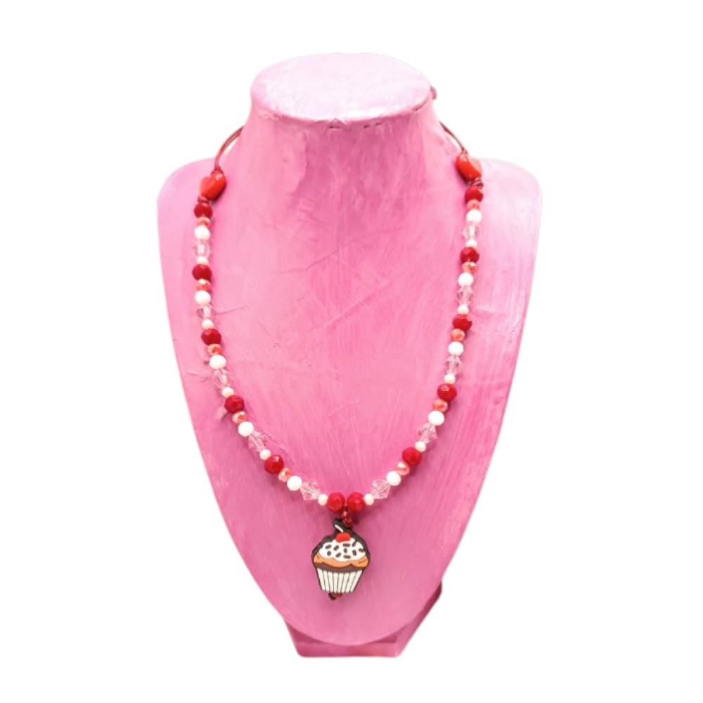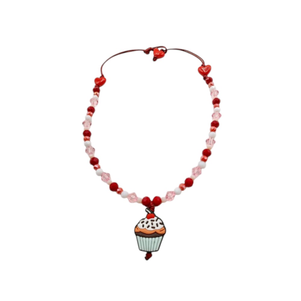 The Colorful Beaded Cupcake Necklace 🧁✨ features vibrant acrylic and glass beads in pink, red, white, and peach shades, adorable red heart beads, and a soft silicone cupcake pendant with frosting and cherry details.