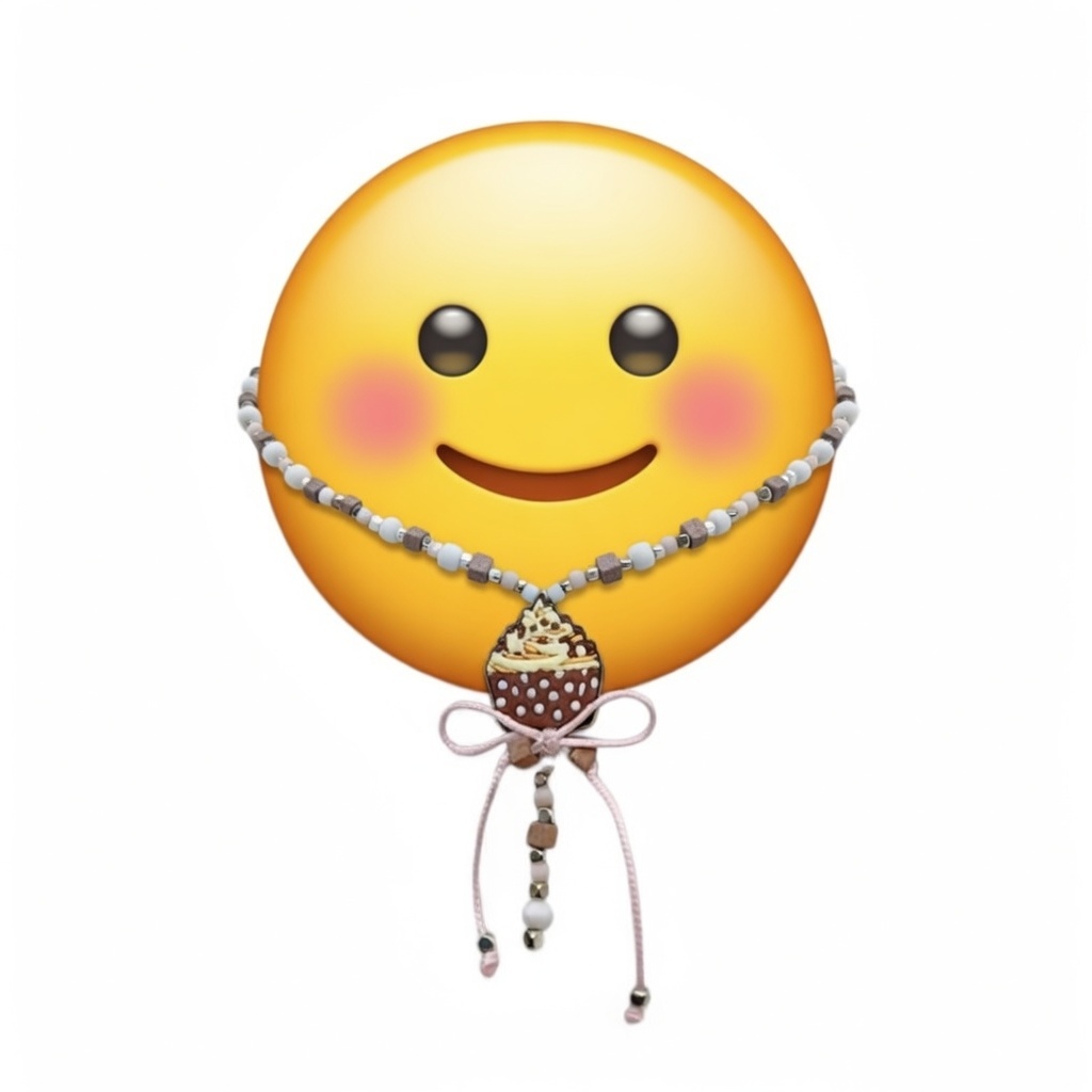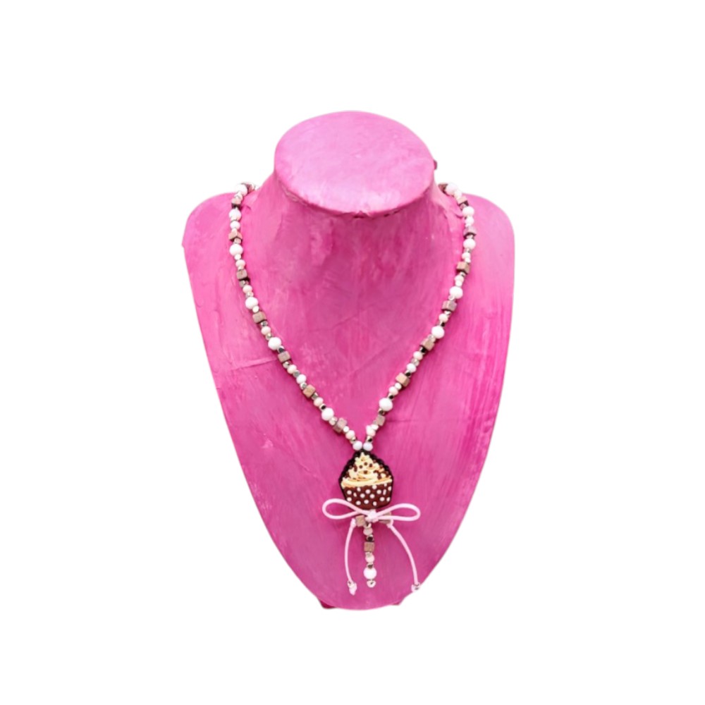 The Cupcake Necklace with Pink Bow 🧁🎀 features a beautiful mix of pastel glass and wooden beads in beige‑pink, white, and brown tones, paired with delicate silver metallic spacers for a soft shimmer.