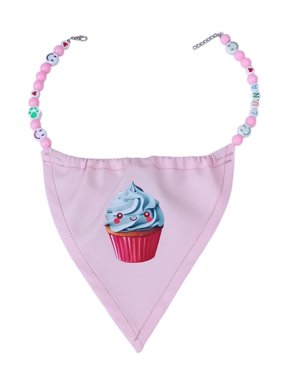 Custom Personalized Name Dog Bandana Necklace – Pink Cupcake Print – Medium Breed Dog Jewelry – Pink Acrylic Beads with Heart, Smile & Paw Charms – Handmade 34cm Adjustable Length