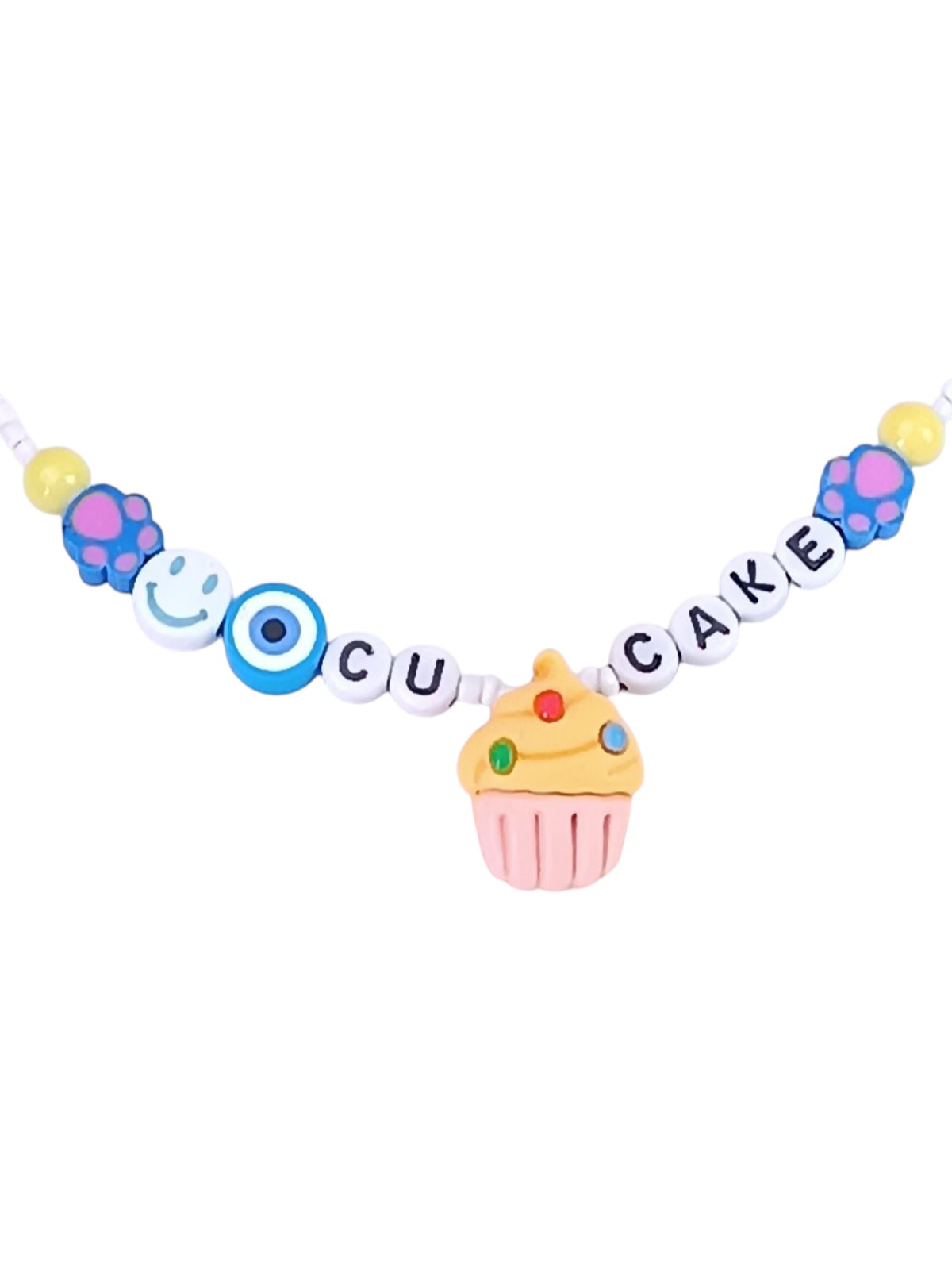 Girls 12+ Kawaii “Cupcake Baked with Love” Necklace – Handmade Colorful Beaded Necklace with Letters “CUCAKE”, Paw, Evil Eye & Cupcake Charm