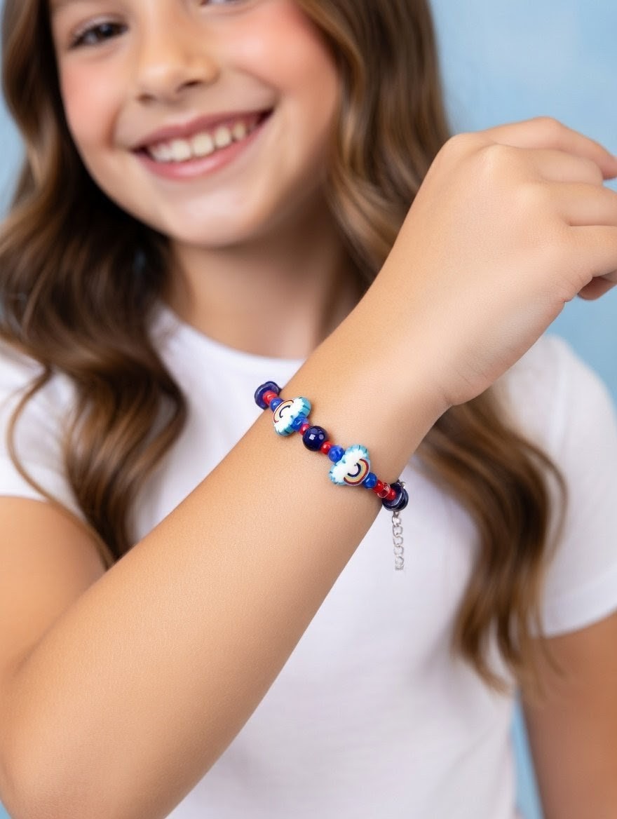 Girls 12+ Kawaii “Rainbow Clouds” Bracelet – Handmade Beaded Bracelet with Orange & Blue Glass Beads and Polymer Clay Rainbow Charms