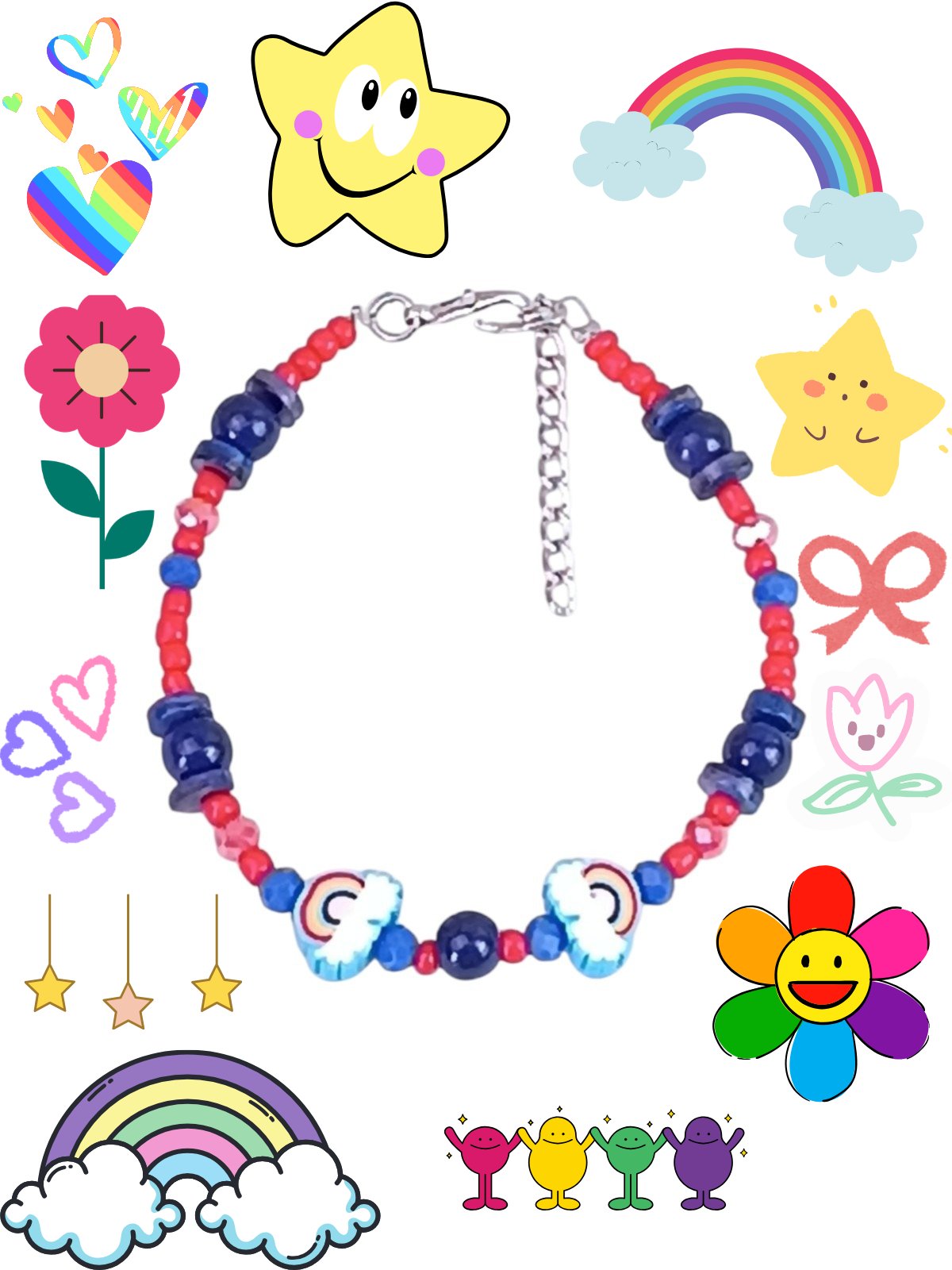 Layer it with other bracelets or pair it with the Rainbow Clouds necklace for a full kawaii rainbow moment that spreads joy wherever you go! ☀️💖
