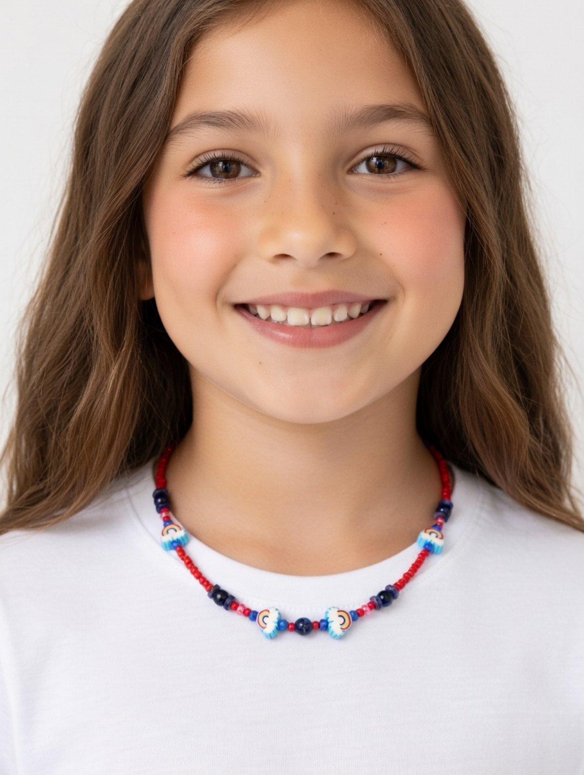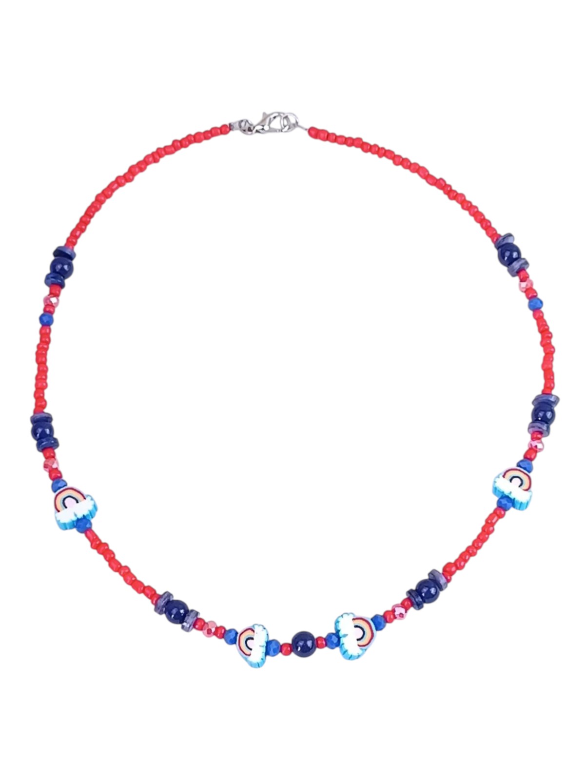 Girls 12+ Kawaii “Rainbow Clouds” Necklace – Handmade Beaded Necklace with Orange & Blue Glass Beads and Polymer Clay Rainbow Charms