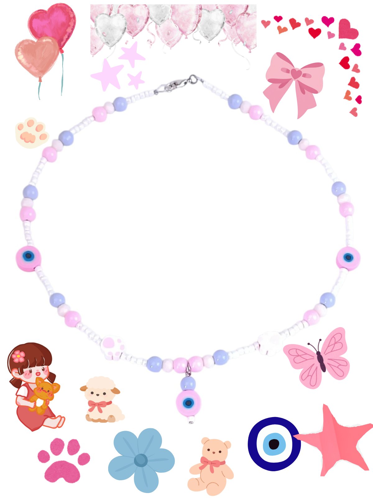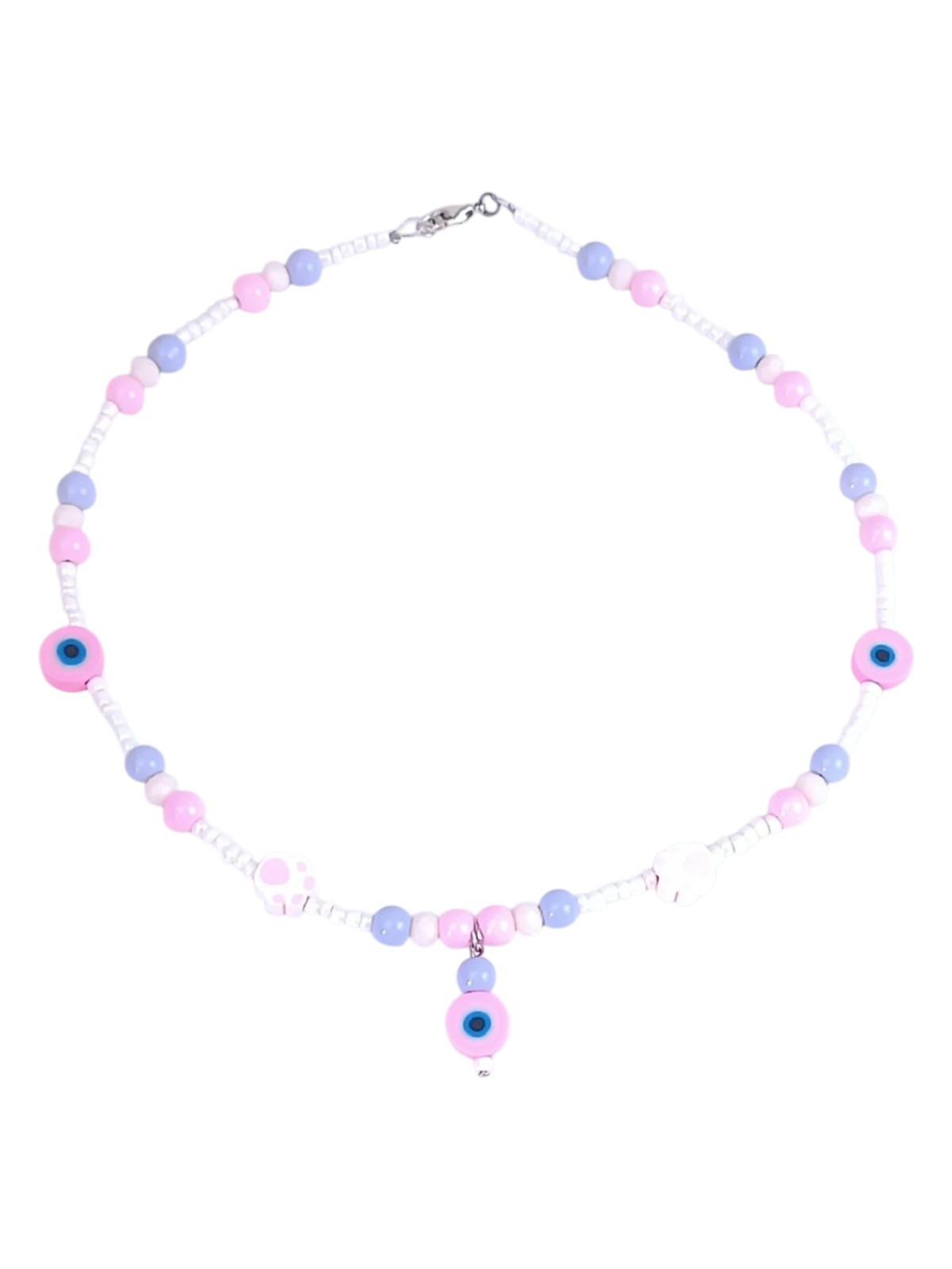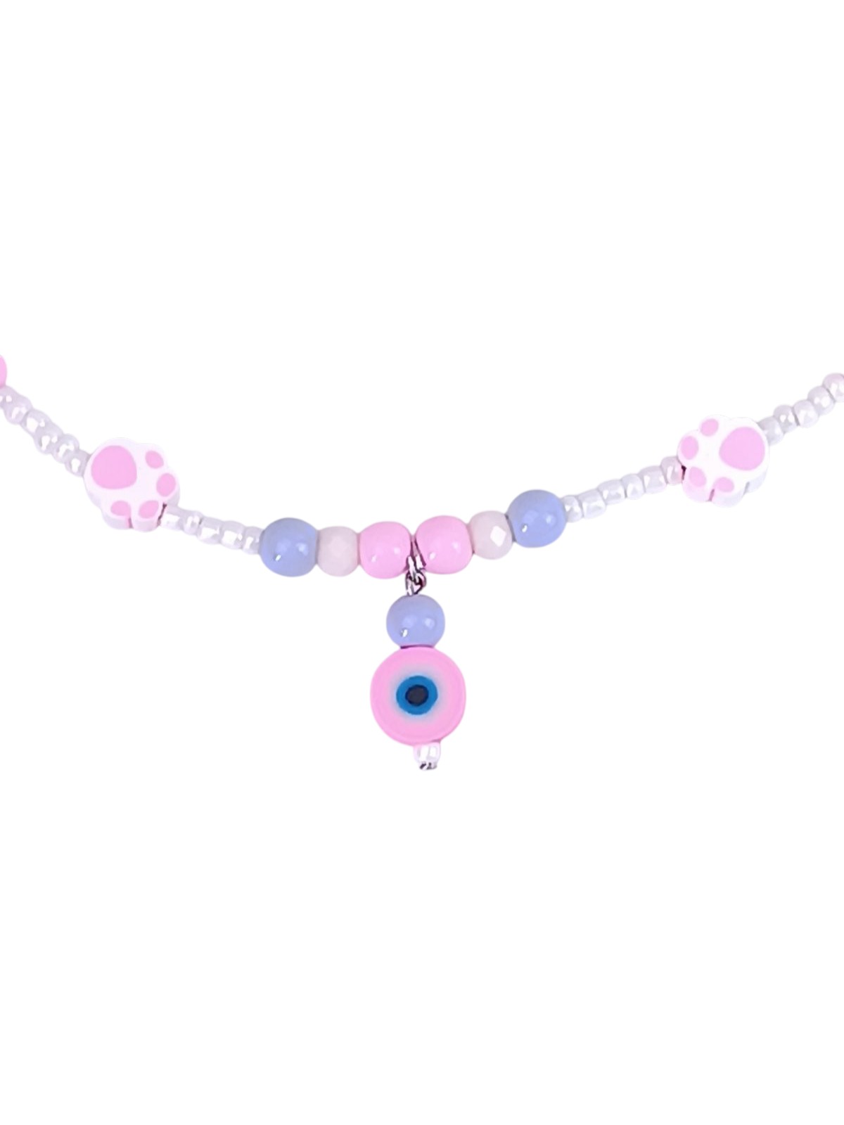 Handmade with pastel beads in lilac, pink , and white tones and decorated with paw and eye charms that bring smiles and positive energy.