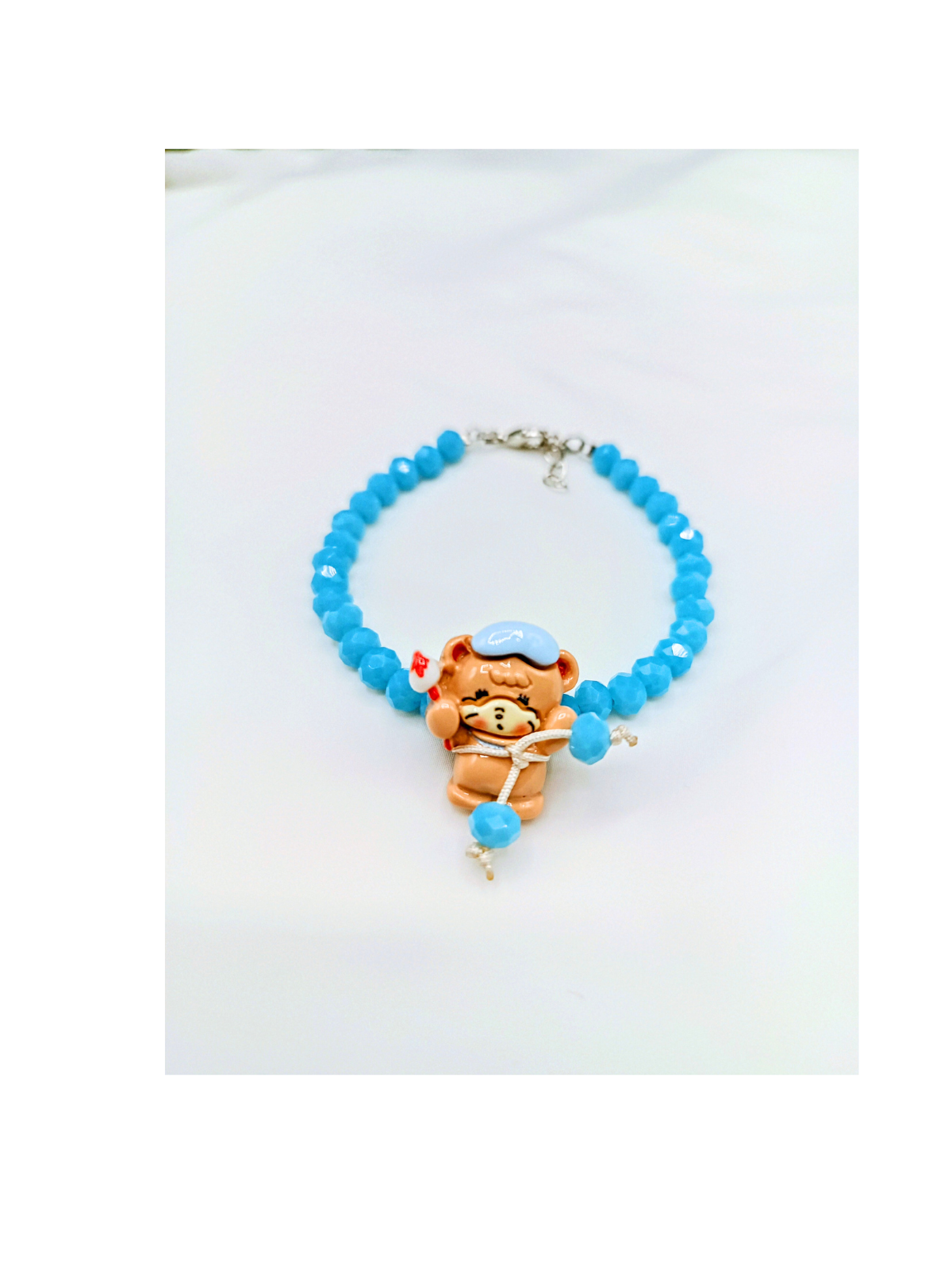 A sweet blue bracelet with glossy glass beads and an adorable 3D teddy bear acrylic charm. Perfect for teen girls who love playful, kawaii jewelry.