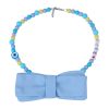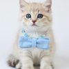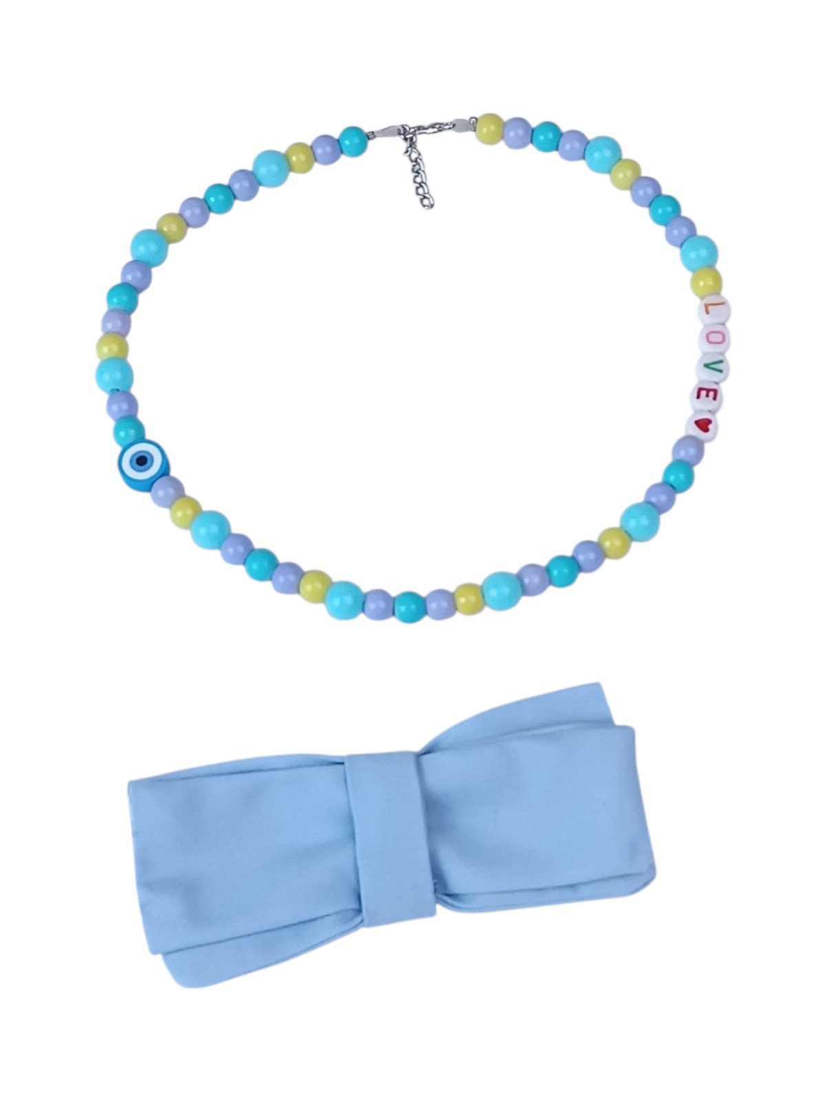 Kawaii “LOVE” Pet Necklace for Cats & Small Dogs – Detachable 9cm Blue Fabric Bowtie – Pastel Blue, Lilac & Yellow Beaded Jewelry – Polymer Clay Evil Eye Charm – Adjustable 35cm Custom Length