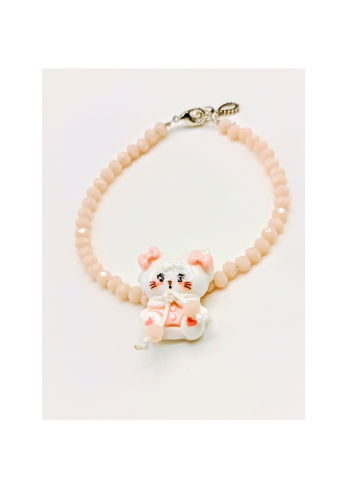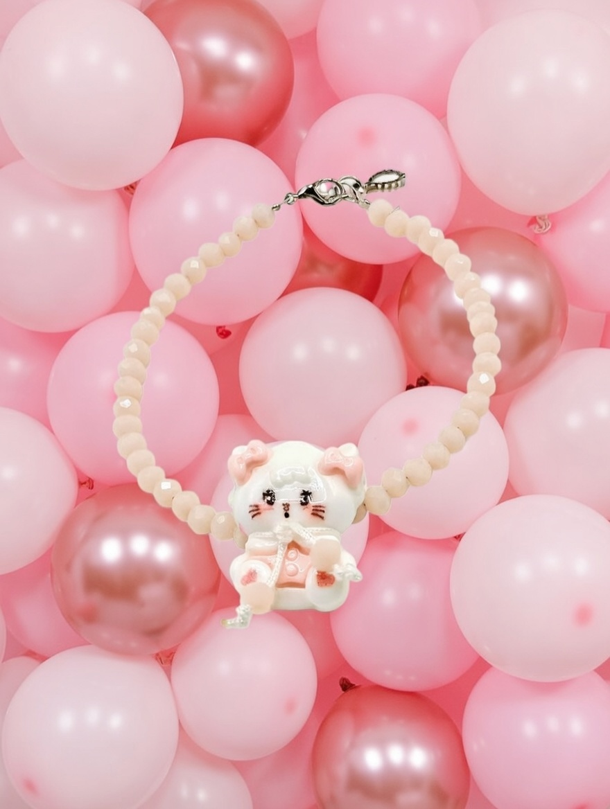 A soft pink bracelet with glossy glass beads and an adorable acrylic cat charm. Perfect for teen girls who love sweet, kawaii‑inspired accessories.