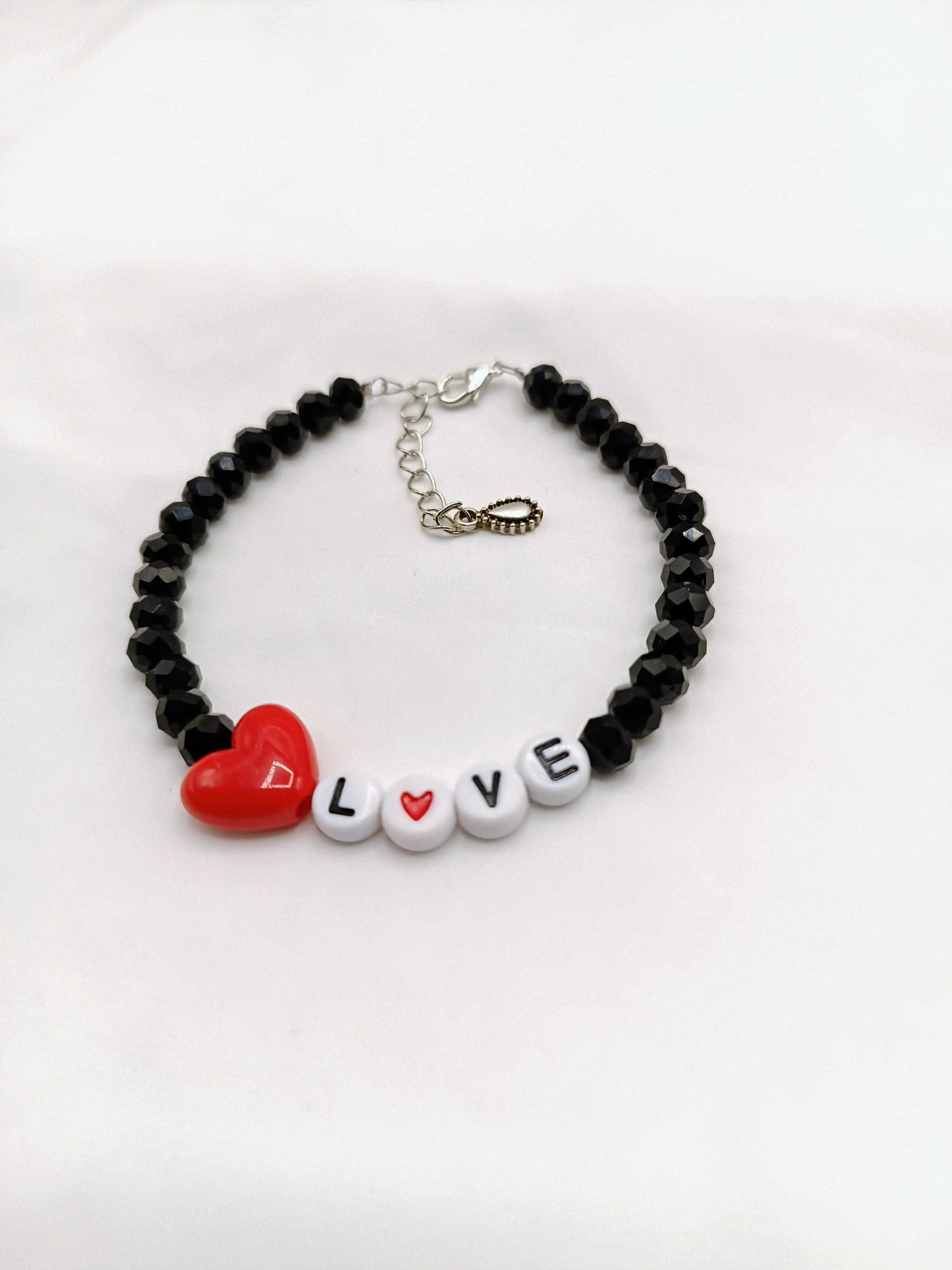 The Love Letters Bracelet is a charming accessory that beautifully conveys affection. Crafted with glass and acrylic beads, it features a striking red heart alongside playful letter beads that spell out “LOVE.”