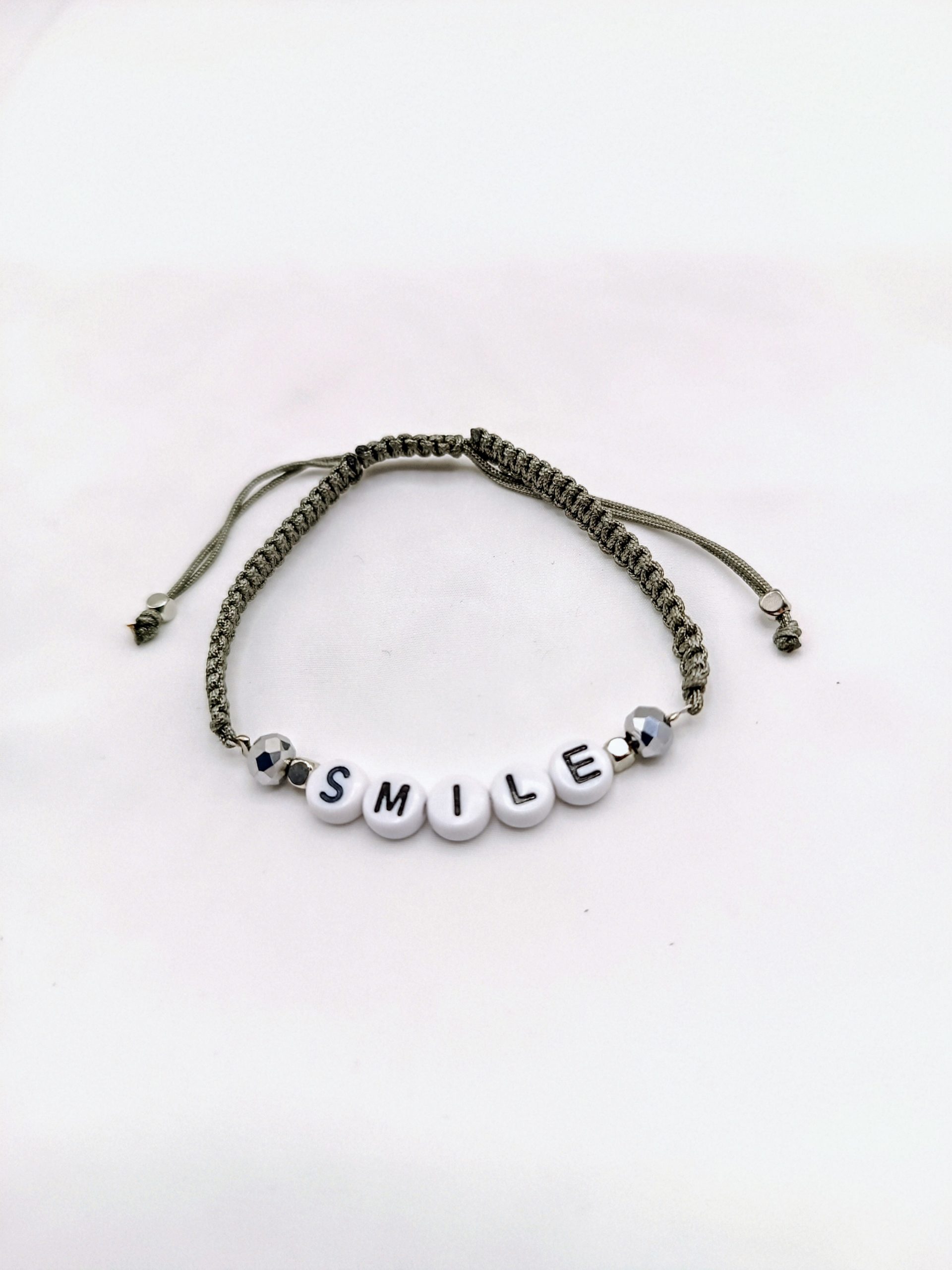 Handmade SMILE Macramé Bracelet — Adjustable Cord, White & Letter Beads, Glass & Metal Spacer Beads