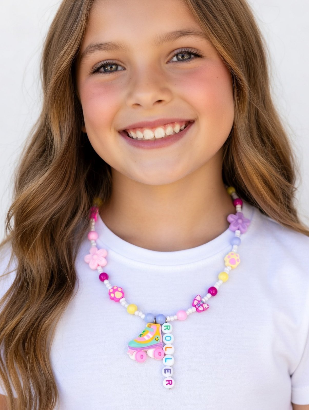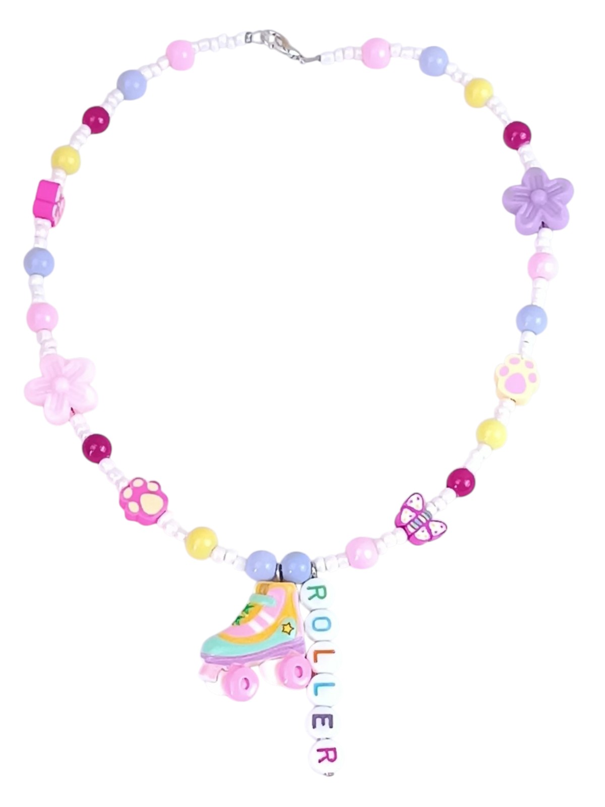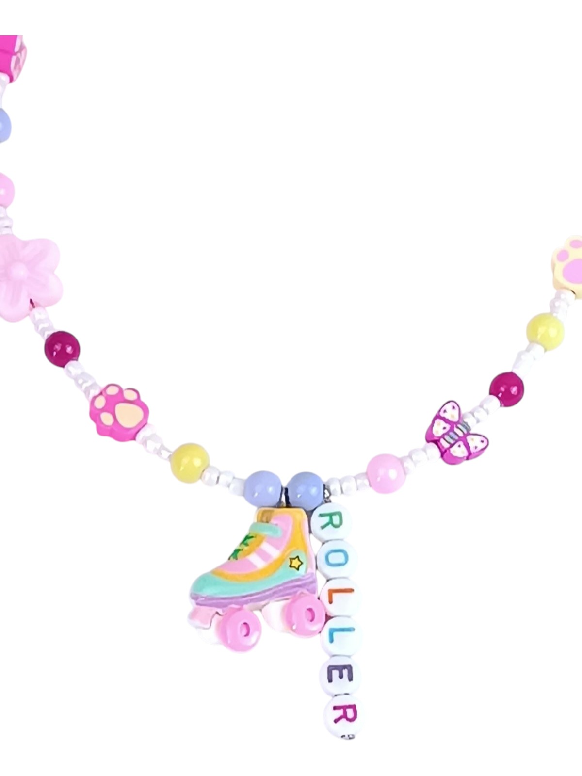 Playful Girls Necklace 12+ with Roller Skate Charm – Adjustable Pastel Beaded Necklace with Flower, Butterfly & Paw Charms 37–44 cm