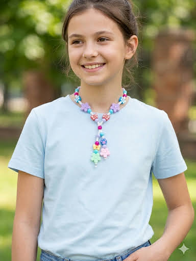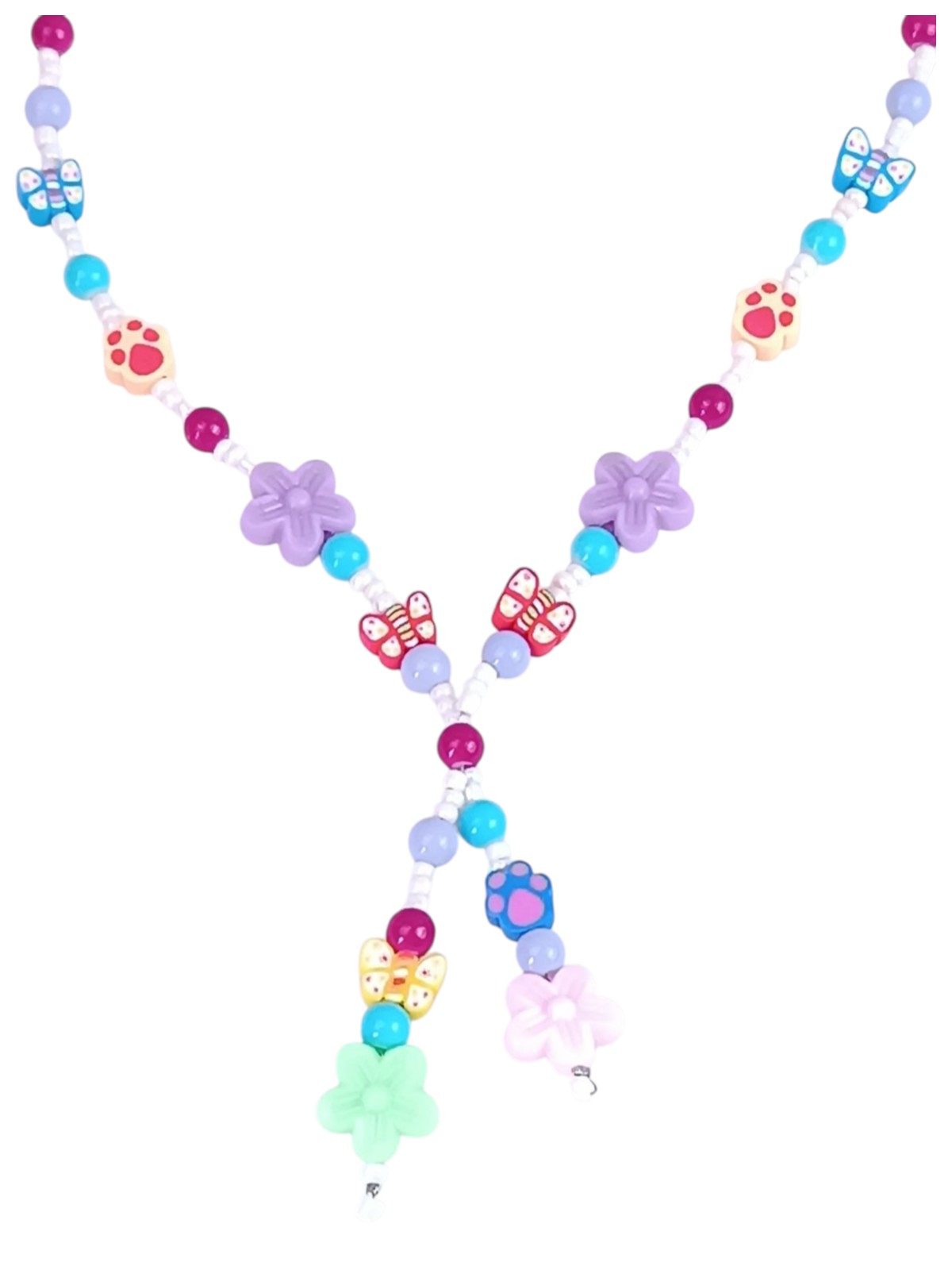 Playful Y‑Shaped Necklace for Girls 12+ – Handmade Kawaii Beaded Necklace with Colorful Glass Beads, Flowers, Butterflies & Paw Charms 40 cm + Extension