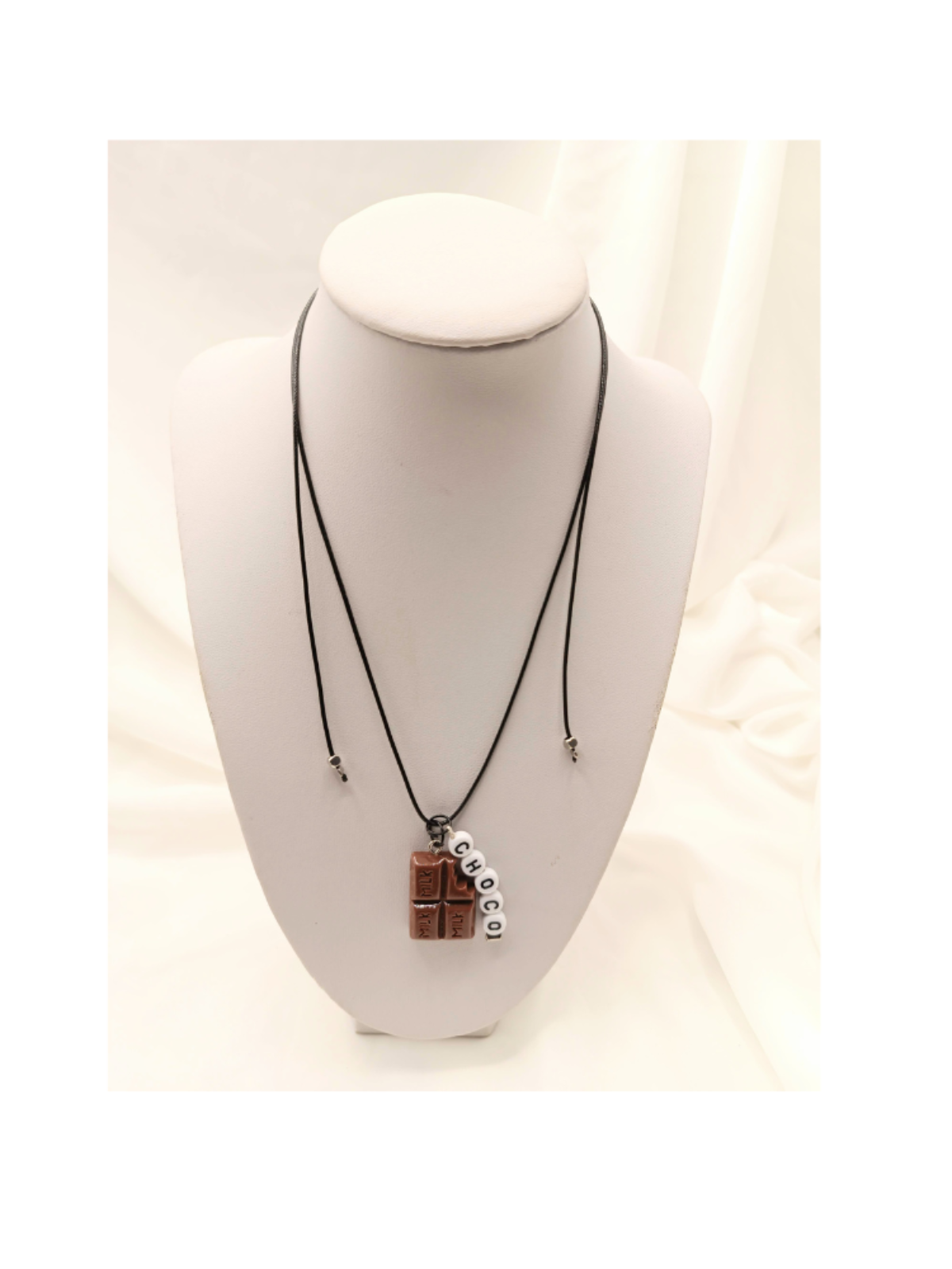 Handmade kawaii necklace with chocolate bar pendant and letter beads, adjustable 80 cm cord, perfect for cute, sweet & Y2K outfits.