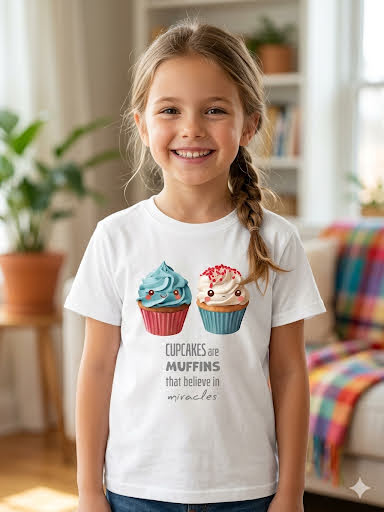Women’s Cupcake Miracle T-Shirt – Kawaii “Cupcakes are Muffins that Believe in Miracles” Graphic Tee – Cute Dessert White Cotton Top – Girls 12+