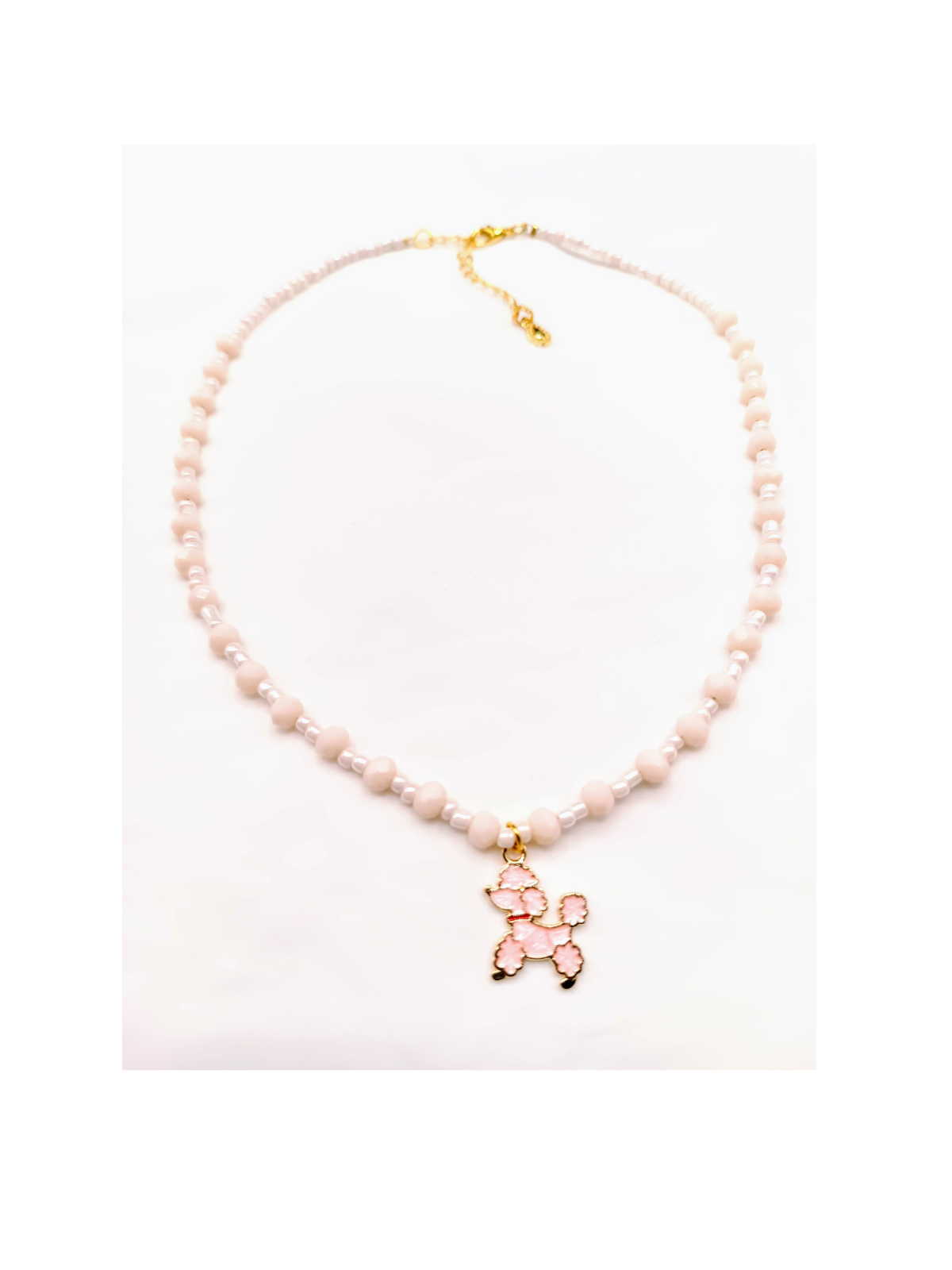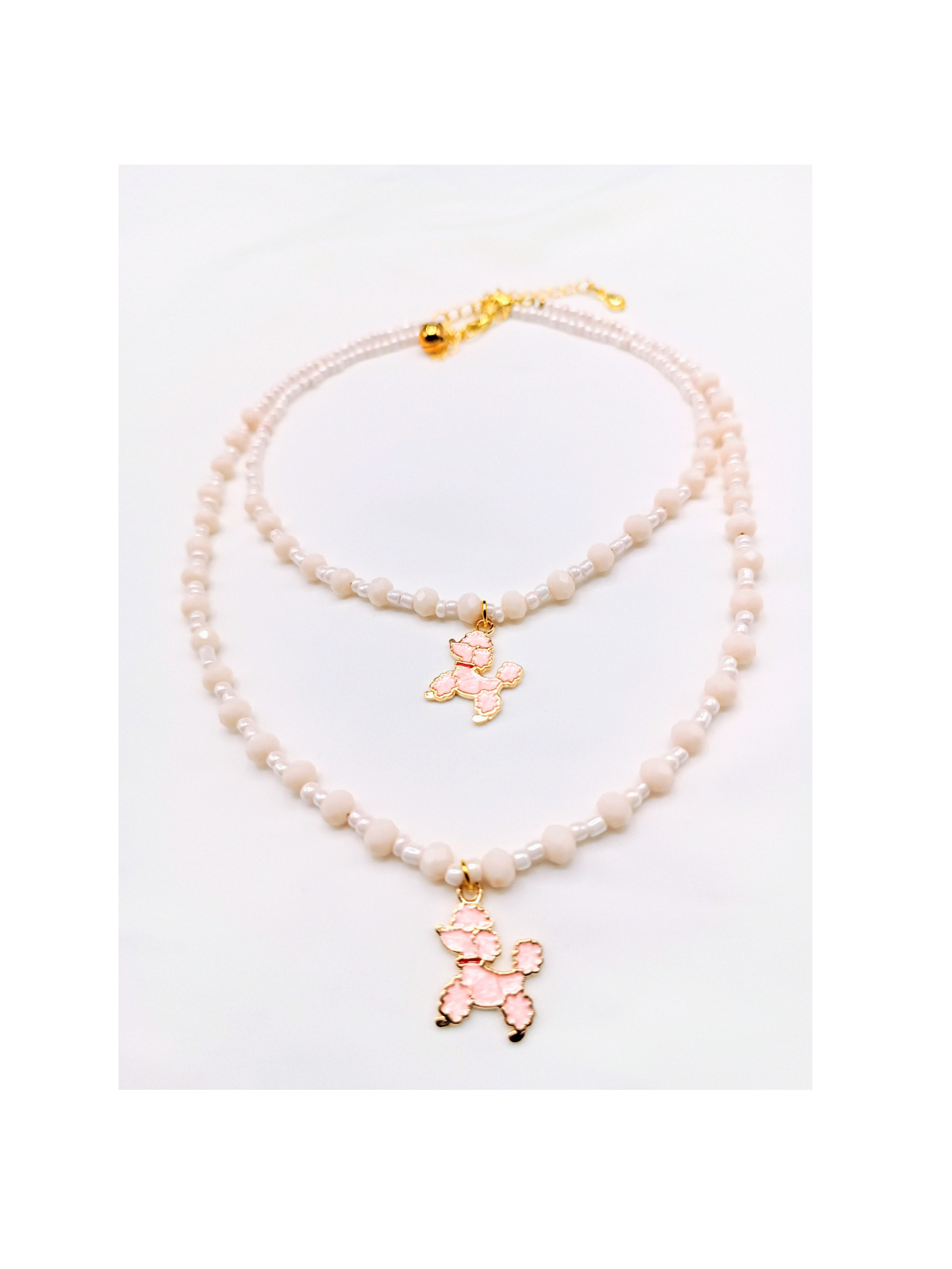 Y2K kawaii layered necklace with soft pink beads and pearl accents. Gold‑plated enamel poodle puppy charm + delicate bell detail. Double design: choker + longer necklace, wearable together or separately. Lightweight, adjustable & comfortable for girls aged 12+. Perfect gift for kawaii fans, dog lovers, pastel aesthetic & cute girly style